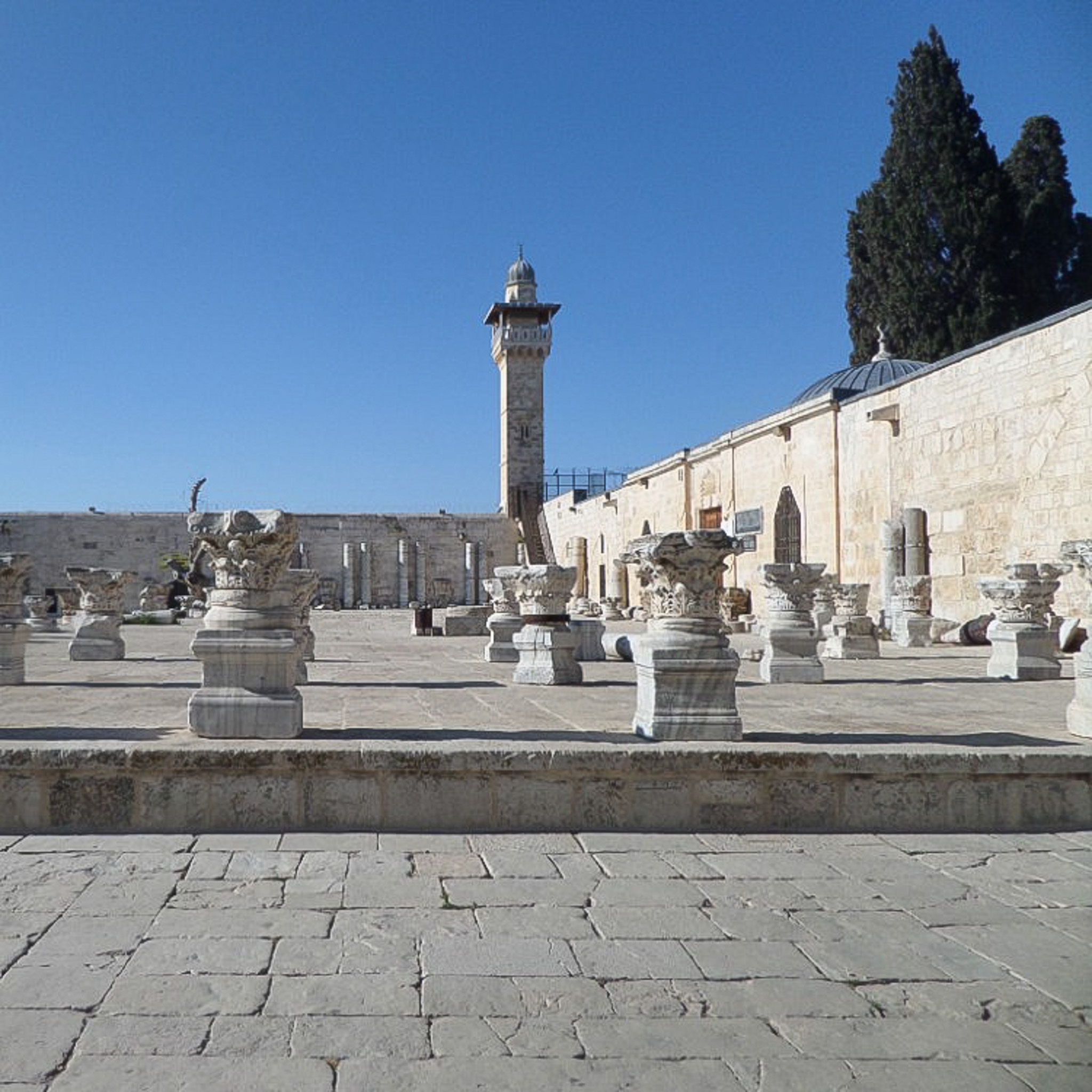 This is an image of Corinthian Columns located on Temple Mount. These Columns are often believed to belong to Herod's Royal Stoa. The Minaret belongs to the Al-Aqsa Mosque.