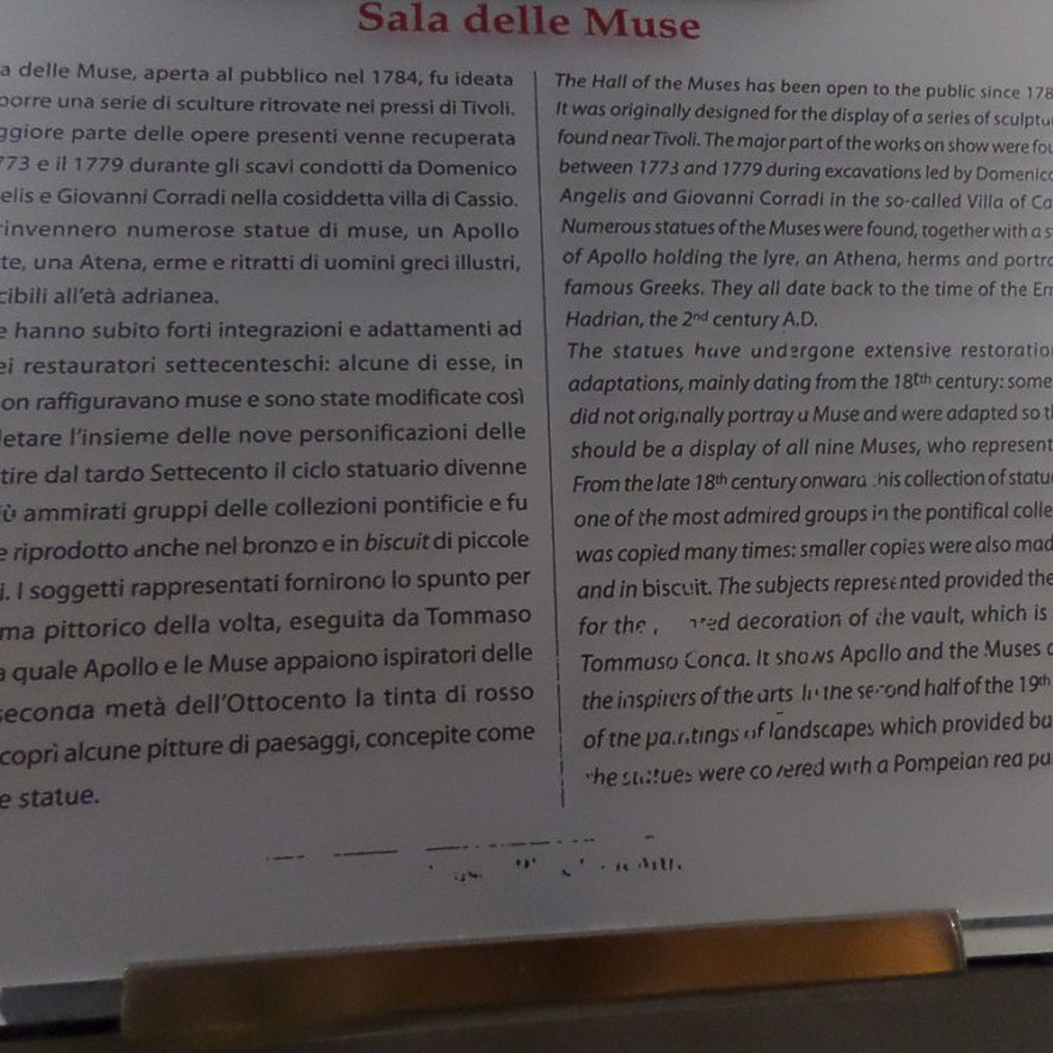 Multiple photos are associated with this record. Please click the links to view all of the items in the series. The photos are of signage for the Hall of the Muses (Sala delle Muse) within the Pio Clementino Museum, which is part of the Vatican Museums. These are public museums that display about 20,000 of 70K works collected by the Catholic Church and the papacy throughout the centuries. The museums were founded by Pope Julius II in the early 16th century. Only the Louvre in France receives more annual visitors than the Vatican Museums. The museums consist of 24 galleries, with the Sistine Chapel being the last room visited. The Pio Clementino Museum is the largest complex of the Vatican Museums. It is named after its founders, Pope Clement XIV and Pope Pius VI. Its twelve rooms contain the most important Greek and Roman masterpieces. The Hall of the Muses contains a series of sculptures which were found in Tivoli, Italy.
