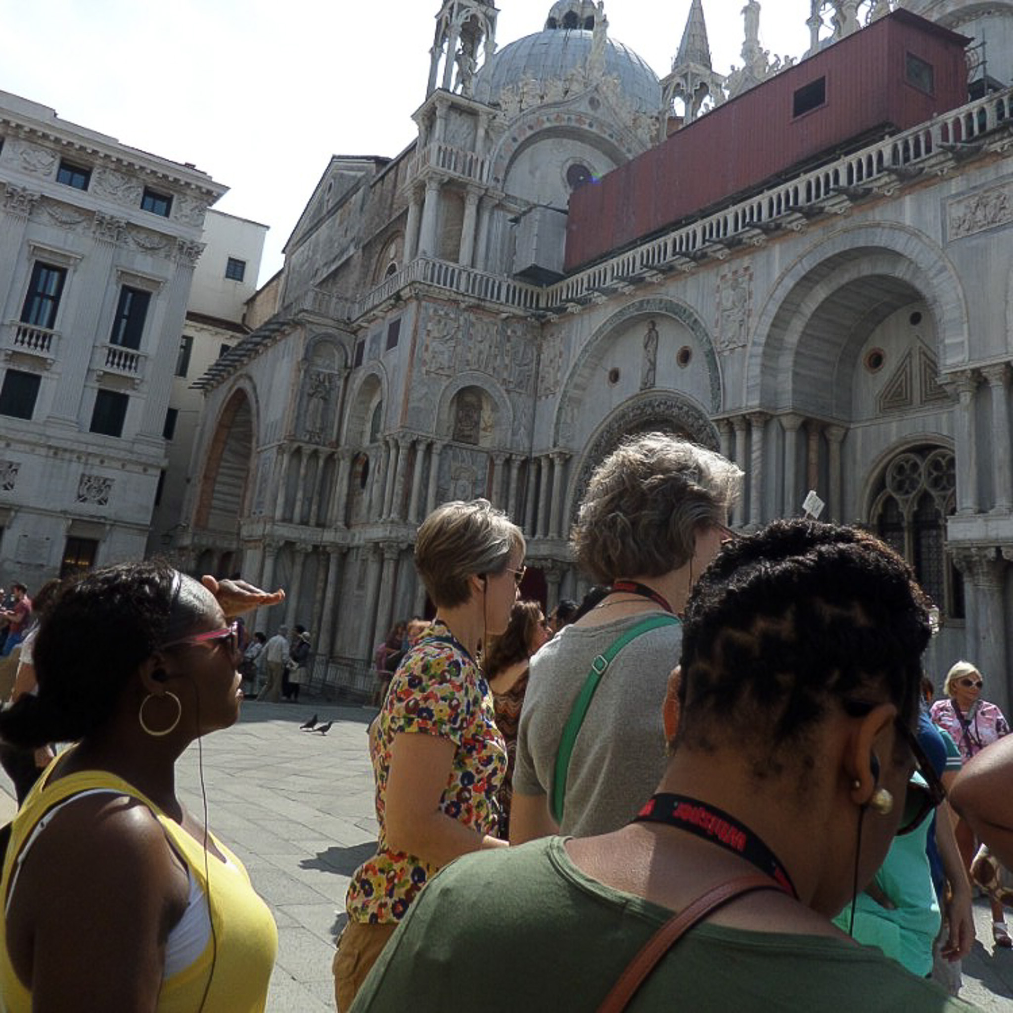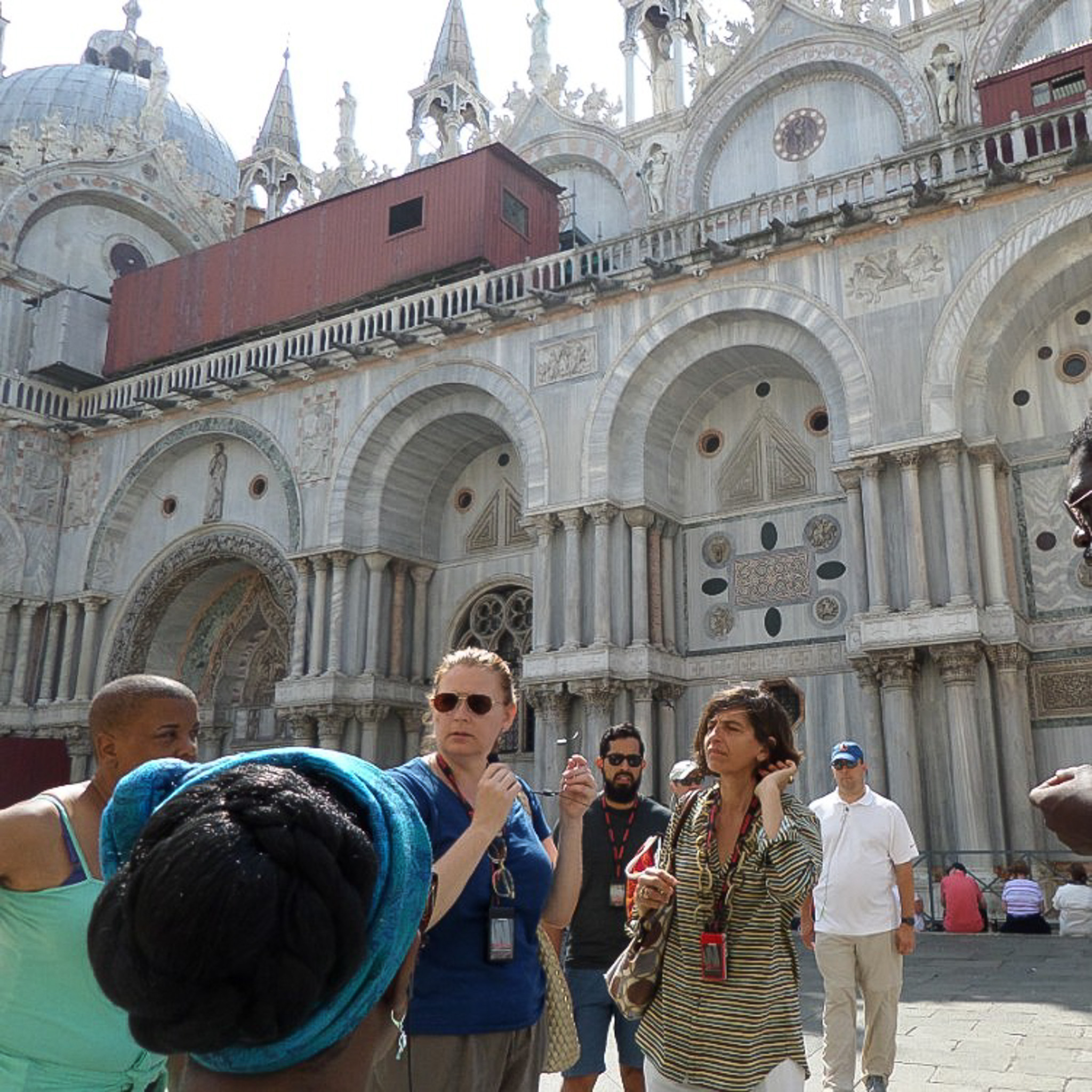 Multiple photos are associated with this record. Please click the links to view all of the items in the series. The photos are of Dr. Sheppard's students from Duke University and their local guide outside St. Mark's Basilica, located in the San Marco district on the island of Venice, Italy. Venice (in Italian: Venezia) is a city in northeastern Italy that is built on a group of 126 islands separated by open water and canals, linked through 472 bridges. The historical island city is home to only 51K people, but a very popular tourist destination with about 60K tourists per day. A UNESCO World Heritage Site, it is renowned for its beauty, architecture, and artwork. The basilica is dedicated to Saint Mark the Evangelist and contains his relics. The church is sited on the eastern end of the Piazza of San Marco, the former center of the Republic of Venice, and is attached to the Doge's Palace. The building was consecrated in 1094 but altered over the next five centuries to its present appearance combining Eastern cupolas with Gothic tabernacles.